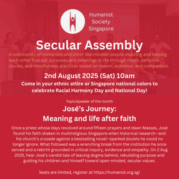 Registration is required, please do so at: https://www.eventbrite.sg/e/secular-assembly-02aug25-tickets-1462742555359