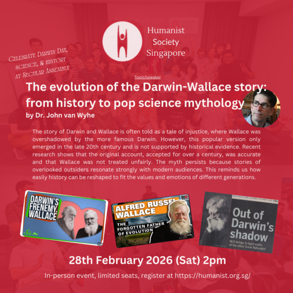 Registration is required, please do so at eventbrite: https://www.eventbrite.sg/e/humanistsg-the-darwin-wallace-story-from-history-to-pop-science-mythology-tickets-1980802752354